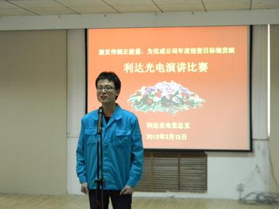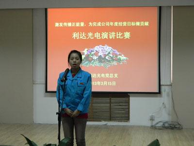 ??????? 為深入學(xué)習(xí)貫徹利達(dá)公司2013年經(jīng)營(yíng)工作會(huì)議精神,進(jìn)一步明確發(fā)展目標(biāo),統(tǒng)一全員思想,激發(fā)傳播正能量,推動(dòng)公司自我變革活動(dòng),在春暖花開(kāi)、充滿希望的季節(jié),利達(dá)光電黨總支舉辦“激發(fā)傳播正能量,為完成公司2013年經(jīng)營(yíng)目標(biāo)做貢獻(xiàn)”演講比賽活動(dòng)。