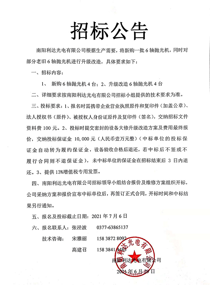 棱鏡事業(yè)部新購(gòu)及升級(jí)改造6軸拋光機(jī)招標(biāo)