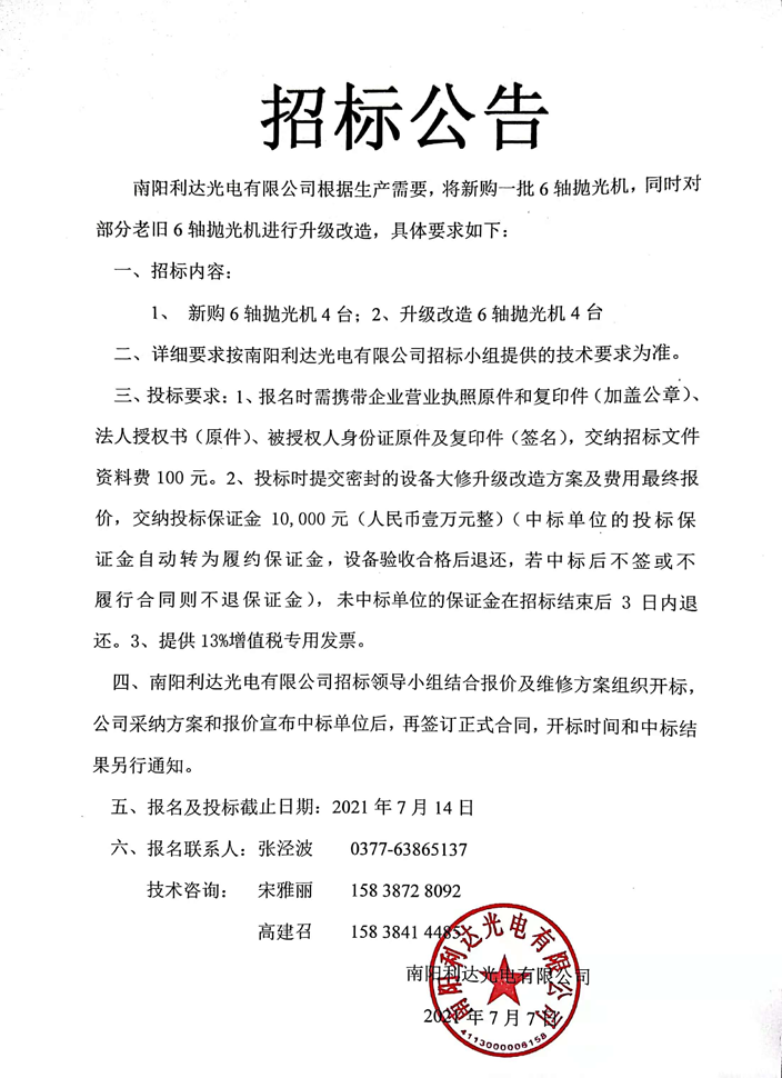 棱鏡事業(yè)部新購(gòu)及升級(jí)改造6軸拋光機(jī)招標(biāo)