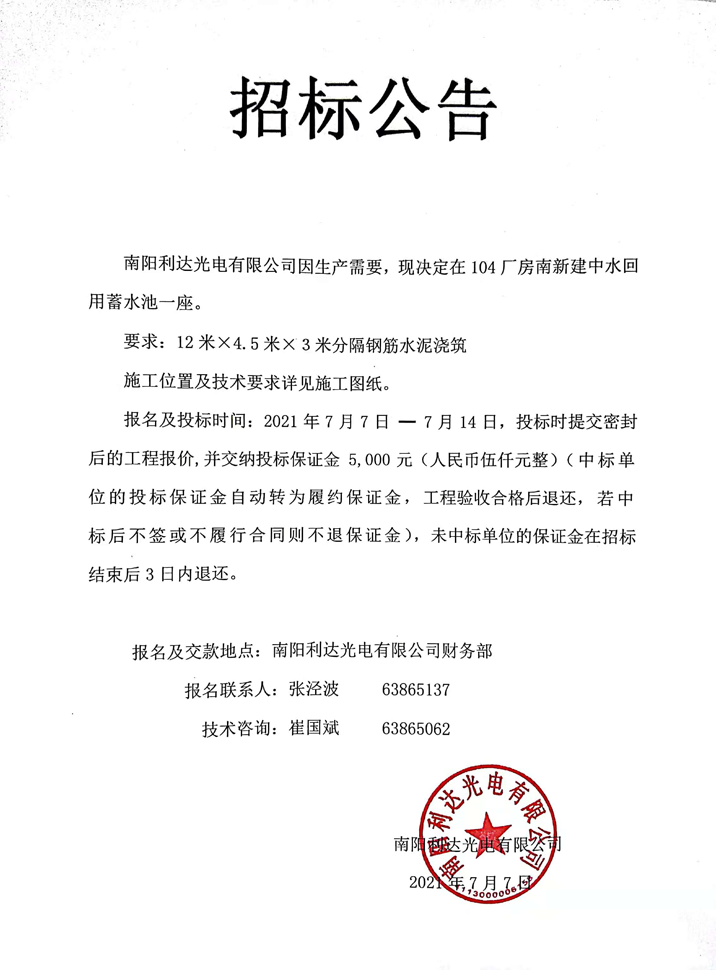 修建104廠房中水回用蓄水池招標