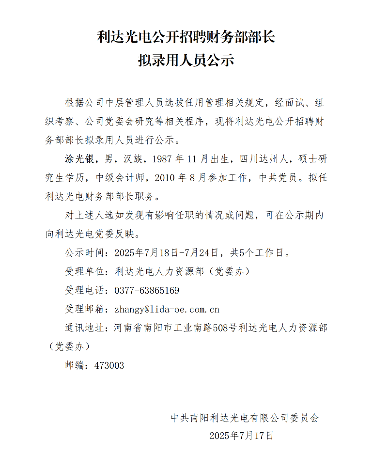 - (2025-07-17)利達光電公開招聘財務(wù)部部長擬錄用人員公示